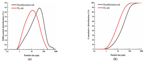 The images of the loess, the desulfurization ash and the fly ash used in the experiment are shown in Figure 1. The loess was collected from Jiancaoping District, Taiyuan City (Taiyuan, China), and its main physical properties are shown in Table 1. The desulfurization ash was provided by Shanxi Pingshuo Coal Gangue Power Plant (Shouzhou, Shanxi, China). Its color is gray, and the density is 2240 kg/m3. Its chemical composition is shown in Table 2. The fly ash is an ordinary grade II fly ash from Taiyuan No. 2 Thermal Power Plant (Taiyuan, Shanxi, China). It can be seen from Figure 1 that the fly ash is darker than the desulfurization ash. The particle size of fly ash varies between 0.5–300 μm, most of which are less than 75 μm, the specific surface area is 361 m2/kg, the density is 2330 kg/cm3, and its specific chemical composition is shown in Table 3 [24]. The particle size distribution curves of desulfurization ash and fly ash are shown in Figure 2.