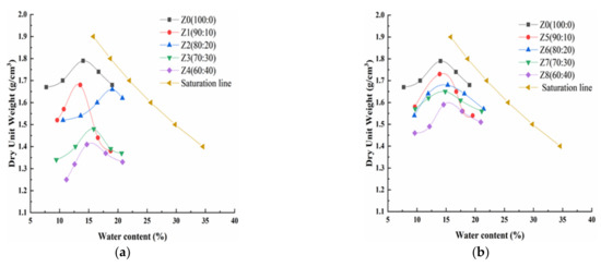 Compaction curves of the loess modified by different solidified materials. (a) Desulfurization ash; and (b) fly ash.