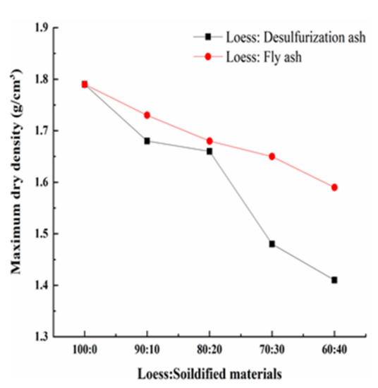 - As the amount of the solidified materials increases, the maximum dry density of the modified loess decreases. Under the same mass ratio of the loess to the solidified material, the maximum dry density of the loess modified by the desulfurization ash is less than that of the fly ash. When the mass ratio is 80:20, the optimal moisture content reaches the maximum. The value of the loess modified by the desulfurization ash is much bigger than that of the loess modified by the fly ash.