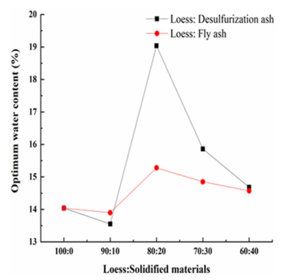 Figure 5 shows that as the amount of the solidified material increases, the optimal moisture content first increases, then decreases and lastly increases. When the mass ratio of the loess and the solidified material is 80:20, the optimal moisture content reaches the maximum. The value of the loess modified by the desulfurization ash is much bigger than that of the loess modified by the fly ash. On one hand, the microstructure of the two solidified materials is different. The desulfurization ash is coarse, irregular, loose and porous, while the fly ash is spheroidal and smooth. The desulfurization ash would absorb more water than the fly ash. On the other hand, the chemical composition is also different. The desulfurization ash has higher content of calcium oxide than the fly ash. Meanwhile, the desulfurization ash has anhydrite, which does not exist in the fly ash. The chemical reaction of the desulfurization ash needs more water [18,27].