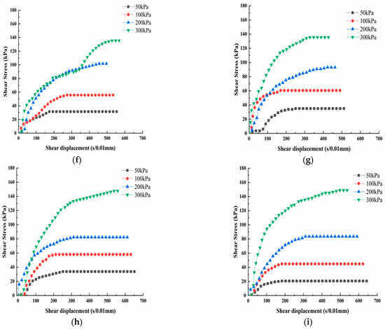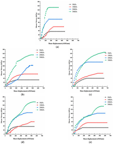The stress-displacement curves of the modified loess are shown in Figure 6. The curves can be categorized into three stages. In the first stage, the shear stress increases rapidly, while the shear displacement has little increase. In the second stage, the stress increases at a slower rate and reaches the shear peak. In the last stage, when the displacement increases, the stress no longer increases, so the curve tends to be stable. The stress-displacement curves under different normal stresses have the same law. The bigger the normal stress, the bigger the ultimate shear stress.