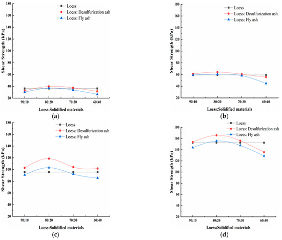 Under the same mass ratio, the shear strength of the loess modified by desulfurization ash is bigger than that of the loess modified by fly ash. When the mass ratio is 80:20, the shear strength of the loess modified by the desulfurization ash is about 9.15% bigger than that of the fly ash on average. When the normal stress is 200 kPa and the mass ratio is 80:20, the shear strength has the maximum difference. The shear strength of the loess modified by the desulfurization ash is about 16.12% bigger than that of the fly ash. The desulfurization ash has a better effect than the fly ash on modifying the loess. Samnang Phoak et al. found that fly ash can increase the California bearing ratio (CBR) value of loess, but it is not obvious [27,28,29].