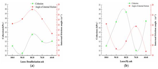 Figure 8 shows the change law of the cohesion and the internal friction angle under different mass ratio. It can be seen from Figure 8a that when the amount of the desulfurization ash increases from 0 to 20%, the internal friction angle and the cohesion of the modified loess both increase. When the amount of the desulfurization ash increases over 20%, the internal friction angle and the cohesion of the modified loess begin to decrease. Therefore, it can be concluded that the best amount of the desulfurization ash is 20%, and the best mass ratio of the loess and the desulfurization ash is 80:20. As opposed to cohesion, the internal friction angle plays a bigger role. It can also be seen from Figure 8b that when the amount of the fly ash increases, the internal friction angle of the modified loess fluctuates up and down, all are inferior to the pure loess. It can be concluded that adding fly ash cannot raise the friction of the loess. When the amount of the fly ash increases from 0 to 20%, the cohesion of the modified loess obviously increases. When the mass ratio is 80:20, the cohesion of the modified loess reaches the maximum. As opposed to internal friction angle, the cohesion plays a bigger role. The influence of fly ash on the modified loess’s internal friction angle and cohesion shows similar laws with magnesium oxide and cement [12,14,30].