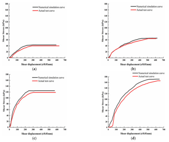 The shear stress-displacement curves under four different normal stresses (50 kPa, 100 kPa, 200 kPa, and 300 kPa) are drawn according to the direct shear test results and numerical calculation results, which are shown in Figure 13.