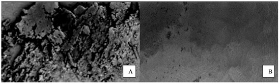 Example of the de-bonded surfaces inspected for failure and its type under 20× magnification (Scanning Electron Microscope, Hitachi High-Tech, HHT, Tokyo, Japan). (A). Image of the dentin surface, (B). Image of the intaglio surface of the coping.