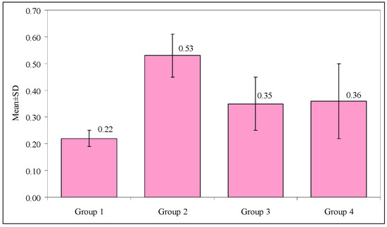 The mean values for the tensile strengths, when compared between the four groups (Group 1 = 0.22 MPa, Group 2 = 0.53 MPa, Group 3 = 0.35 MPa, and Group 4 = 0.36 MPa) using the One-way ANOVA test, are shown in Table 6. Their p-values were all less than 0.001, indicating statistical significance. Figure 5 shows the comparison of the mean values of the tensile strengths in the four groups.
