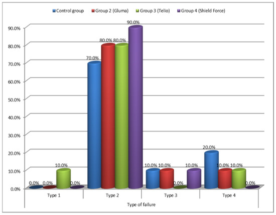 Comparison of the failure-type distribution in the four groups. Group 2: Treated with Gluma dentin desensitizer; Group 3: Treated with Telio CS desensitizer; Group 4: Treated with Shield Force Plus desensitizer.