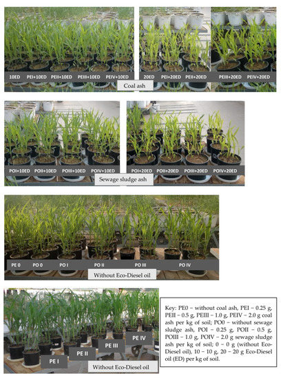 4.2. The Effect of Ashes Application on Plants on Soil Contaminated with Eco-Diesel Oil