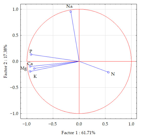 Content of macroelements in the aerial parts of maize (Zea mays L.) illustrated with the PCA method. Key: vectors represent analyzed variables (content of N, P, K, Na, Ca and Mg).