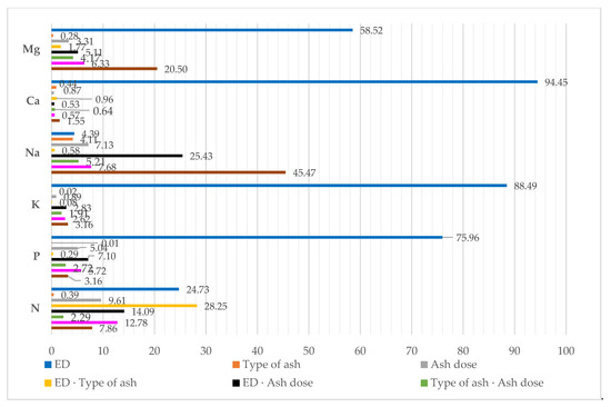 The percentage of the observed variation identified with η2, using the ANOVA method, showed that the content of macronutrients in maize was mostly affected by the dose of diesel oil polluting the soil. As for calcium, potassium, phosphorus and magnesium, this factor was responsible for 94.45%, 88.49%, 75.96% and 58.52% of the variation of the respective variables (Figure 4). Much smaller values were obtained for the other elements, i.e., sodium and nitrogen. They were 4.39% and 24.73%, respectively. The effect of the type and doses of ash on the chemical composition of aerial parts of maize was demonstrably weaker and never exceeded 10%, while being the strongest for a dose of ash and the content of nitrogen.