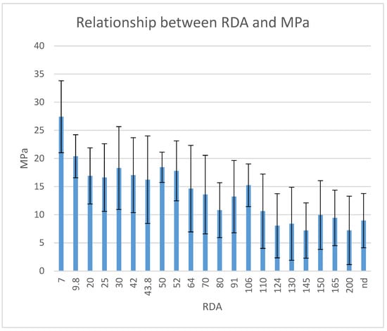 Descriptive statistics for the twenty-two groups are shown in Table 4 and Figure 1. The ANOVA test showed significant differences between groups (p < 0.0001). Tukey’s post-hoc test revealed that teeth without pretreatment or treated with toothpastes with high RDA values (Colgate Whitening—124; Crest Extra Whitening–130; Ultra Brite Advanced Whitening-145; Pepsodent Complete Care—150; Colgate Tartar Control—165; Colgate 2 in 1 Tartar Control/Icy Blast Whitening—200) did not have significantly different SBS values (p > 0.05); SBS values were significantly lower if compared to the other groups (p < 0.05). The Pearson correlation coefficient showed a moderate correlation between SBS and RDA values (r = −0.5779).