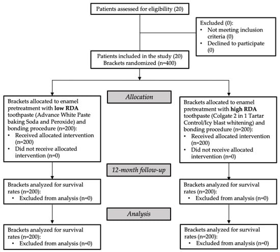 The in vitro experimental study aims to evaluate the effect of RDA on Shear Bond Strength (SBS) values and Adhesive Remnant Index (ARI) scores. The clinical trial compares the survival rate of brackets bonded after pretreatment with low and high RDA value toothpastes. The three null hypotheses of the present report were: (1) there was no difference in SBS values among different pretreatments with various RDA toothpastes; (2) there was no difference between ARI scores of the pretreatments with various RDA toothpastes; (3) there was no difference in the clinical survival rate of brackets bonded on enamel pretreated with low RDA value toothpastes compared to high RDA value toothpastes.