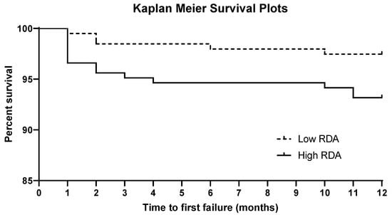 Comparison of failure rates between low and high RDA values for the total amount of brackets bonded.