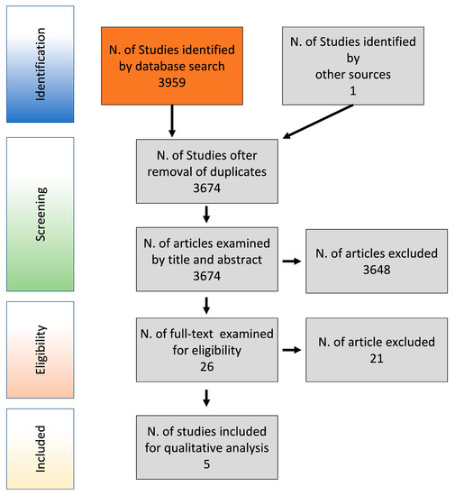 Table 1 shows the performed electronic searches, providing the following information for each search: electronic database, date of search, search strategy, and number of retrieved items. Electronic searches have identified 3959 studies; one study has been retrieved from external sources. 3674 articles remained after the duplicates removal and were examined on the basis of title and abstract. After this first screening, 3648 articles were excluded and the remaining 26 were examined for eligibility based on the full text. At the end of this further selection 5 studies were identified. Figure 1 reports the selection flow chart according to the PRISMA guidelines.
