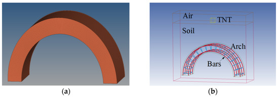 Explosion experiments are usually very complicated and costly. Therefore, it is difficult to conduct large-scale experiments repeatedly. However, numerical simulation can better reveal the dynamic responses of structures under the action of explosive loads by accurately controlling each explosion variable [26]. In previous studies, less attention has been paid to the dynamic response of BFRP reinforcement members under explosive loads. For common structures in engineering [27], some researchers conducted limited anti-explosion experiments, but they could not well summarize the dynamic response laws of BFRP reinforced concrete arches.