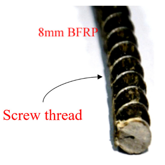 BFRP bars are composed of basalt fiber and resin matrices. In particular, the process is derived from the traditional wet layup method, but it is automated from tube to bar in one stage. The bars are wrapped during the process with a helix to give the desired screw thread form to achieve superior bond strength with concrete. As shown in Figure 3, the BFRP bars were provided by Shandong Safety Industrial Company, and the related material properties of reinforcement samples are listed in Table 7, which were directly acquired from the manufacturer, Shandong Safety Industrial Company.