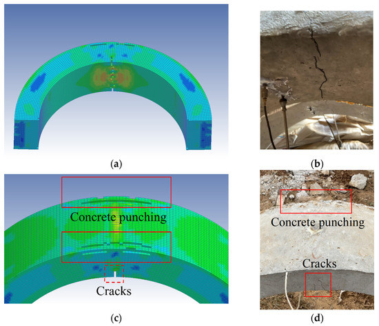 The penetrating concrete cracks of inner sides of (a) the simulated and (b) the experimental arch, the failures on the lateral sides of the vault of (c) the simulated and (d) the experimental arch.