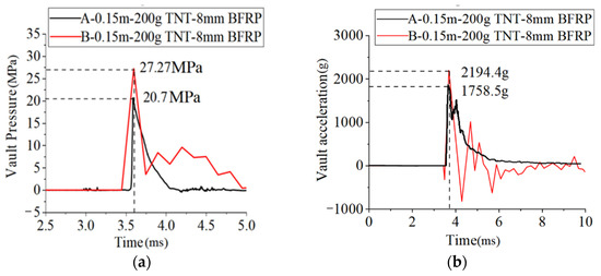 Comparison of the experimental and simulated time history curves of (a) the dynamic pressure, and (b) the acceleration at the vault. (Curve A: experimental result, curve B: simulation result).