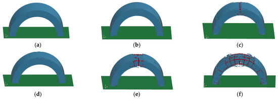 The LS-DYNA software was used to conduct the numerical simulation to calculate pressure, displacement, and acceleration at the vault of the BBCA structure. Figure 6 shows the macroscopic failures of the simulated arch under the denotation of 0.2 kg TNT with a standoff distance of 0.15 m.