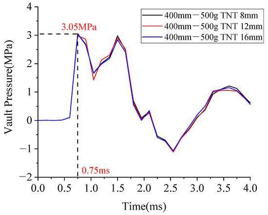 There were many working conditions in this study. To facilitate the analysis, some working conditions were taken for the analysis, their laws were summarized, and then the whole set of working conditions was studied. When the standoff distance was 0.4 m and the amount of TNT was 0.5 kg, the shapes of pressure curves of the BBCA vaults with diameters of 8 mm, 12 mm, and 16 mm were almost the same, and the peak pressure reached 3.05 MPa. At the end of the explosion, the pressure on the vault was zero and there was no residual stress.