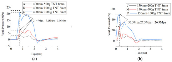 By calculating the scaled distance, the peak pressure of the vault can be effectively predicted, so the structure could be designed for achieving the targeted explosion resistance. Under the impact of explosion, the pressure often reaches its peak point in a short time. Thus, it was meaningful to study the effect of the working conditions. Table 6 lists the impulses under the working conditions of A, D, G, J, M, and P.