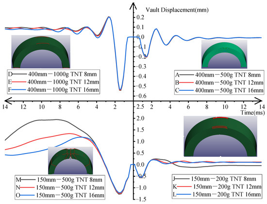 When simulating the effect of the explosion, the arch structure was destroyed with a small standoff distance and the displacement of the concrete unit at the vault ‘blew up’. Therefore, the dynamic displacement curves with a standoff distance of 0.4 m and an amount of TNT of 0.5 kg and 1 kg as well as with a standoff distance of 0.15 m and an amount of TNT of 0.2 kg and 0.5 kg were taken for the comparative study. The results are shown in Figure 12.