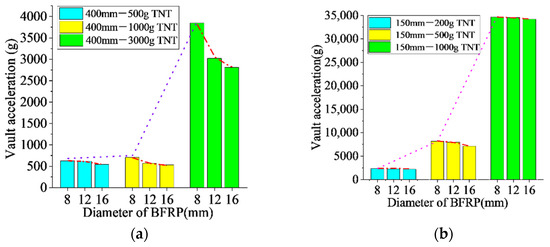 Peak acceleration at vault under various anti-explosion conditions: (a) standoff distance of 0.4 m, (b) standoff distance of 0.15 m.