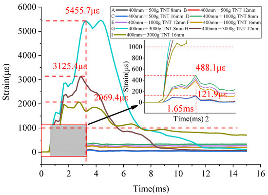 In Figure 15a, the time history curves of the strain of the BFRP bars under the working conditions of A, B, and C were selected for comparison. It can be seen that the strains at the vault and the hance were ‘alternating’. At the beginning of the explosion, the vault was directly stressed and the strain of the BFRP bars quickly reached the peak value. Then the blast wave was transmitted from the vault to the hance. The strain of the BFRP bars on the hance began to increase and reached the peak value at the moment when the strain of the vault reached the minimum value after having the peak value.