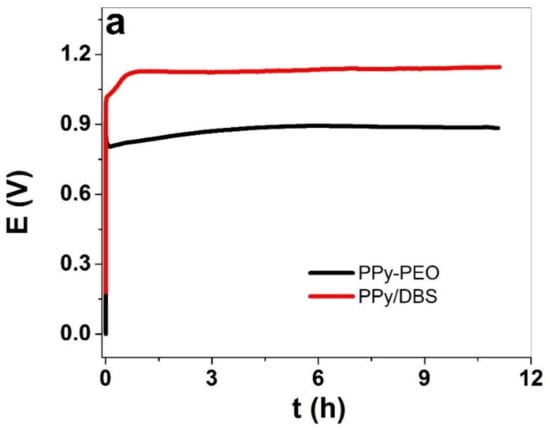 The EIS measurements in PC solvent of PPy films directly after polymerization (Figure 2c) revealed Zre values of 5405 ± 212 Ω for PPy/DBS, and by putting those values in Equation (3) the ion conductivity was calculated as 1.1 ± 0.04 μS/cm. In the case of PPy-PEO, the Zre value was 4159 ± 185 Ω, which led to ion conductivity of 1.44 ± 0.06 μS/cm which was nearly 1.3 times higher than those in PPy/DBS. In summary, FTIR spectroscopy showed that all PPy signals as well those from DBS− are shown in PPy/DBS and PPy-PEO, and PEO inclusion in PPy was also identified. Raman spectroscopy confirmed that PPy-PEO has a higher doping state than PPy/DBS, and EIS measurement revealed an enhancement of ion conductivity, shown as well from past research [].