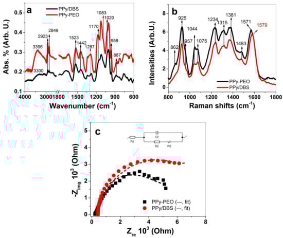 To investigate the composition of PPy/DBS and PPy-PEO directly after polymerization (in oxidized state at 1.0 V), FTIR and Raman spectroscopy were performed, with results shown in Figure 2a,b, respectively. The results of EIS measurements in PC solvent are presented in Figure 2c.