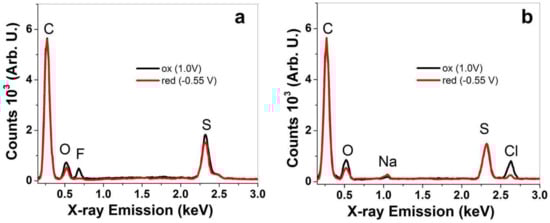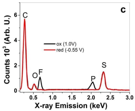 In general EDX spectroscopy, here all spectra normalized on the carbon peak “C” at 0.27 keV show the basic components of PPy doped with DBS− with oxygen “O” peak at 0.52 keV and sulfur peak “S” at 2.32 keV for PPy-PEO in Figure 3a–c and for PPy/DBS in Figure S1a–c. A slightly higher oxygen peak refers to PEO incorporation in PPy-PEO films []. The element composition after actuation at oxidation/reduction revealed a qualitative expression in which elements are detected in the PPy films. In the case of EDMICF3SO3-PC electrolyte, the fluoride peak “F” at 0.67 keV represents the anion CF3SO3− shown in Figure 3a only at oxidation for PPy-PEO films (oxygen and sulfur peak are also increased). The PPy/DBS film in EDMICF3SO3-PC electrolyte (Figure S1a) revealed a small peak of fluoride at reduction, from which we assume that CF3SO3− anions stayed immobile in the PPy/DBS film, resulting in a certain amount of expansion at reduction. With the stronger fluoride peak at oxidation, the anions are incorporated during oxidation. The EDX spectra (Figure S1a) give evidence for mixed-ion influence. The electrolyte NaClO4-PC in Figure 3b (shown for PPy/DBS in Figure S1b) had two additional elements, namely sodium “Na” at 1.04 keV and chloride “Cl” at 2.63 keV. For PPy-PEO (Figure 3b), there is a dominant chloride peak at oxidation with a stronger oxygen peak referring to ClO4 anions, while at reduction a small chloride peak remains with a minor sodium peak. In the case of PPy/DBS (Figure S1b), the sodium peak at reduction is much stronger, and sodium and chloride peaks are also found at oxidation. Therefore, the NaClO4-PC electrolyte has anion and cation movement in PPy films and is more pronounced for Ppy/DBS than Ppy-PEO. As shown in Figure 3c (Figure S1c, Ppy/DBS), the electrolyte TBAPF6-PC is applied in PPy-PEO films having a fluoride peak at 0.67 keV and a phosphor peak “P” at 2.04 keV, describing the anion PF6−. In the case of PPy-PEO films (Figure 3c), there is only PF6− movement at oxidation, while in PPy/DBS (Figure S1c) small fluoride and phosphor peaks are retained at reduction []. There are molecules such as DBS− and PEO which do not change during the oxidation/reduction process in the PPy samples. The different anions from the applied electrolytes give evidence of fluoride peaks, chloride peaks and phosphor peaks growing or shrinking during oxidation/reduction process to evaluate which ions are moving. Further analysis in linear actuation studies will reveal how the ion movements influence the linear actuation properties.
