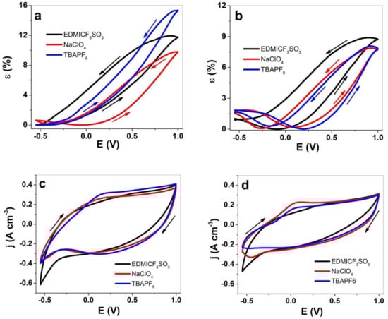 Cyclic voltammetry (scan rate 5 mV s−1) applied to PPy samples in EDMICF3SO3-PC (black curve), NaClO4-PC (red curve) and TBAPF6-PC (blue curve) electrolytes at potential range 1.0 V to −0.55 V showing strain ε of (a) PPy-PEO and (b) PPy/DBS against potential E. The current density potential curves for (c) PPy-PEO and (d) PPy/DBS samples. The arrows indicate the start and end points of the cycles.