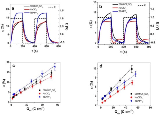 Square potential steps at applied frequency 0.0025 Hz (two subsequent cycles 3rd−4th) in potential range 1.0 V to −0.55 V (E, dashed line) in electrolytes EDMICF3SO3-PC (black curve), NaClO4-PC (red curve) and TBAPF6-PC (blue curve) showing strain of (a) PPy-PEO and (b) PPy/DBS films. The strain against charge densities in electrolytes EDMICF3SO3 (■), NaClO4 (●) and TBAPF6 (◄) for (c) PPy-PEO and (d) PPy/DBS films. The dashed lines represent the linear fit shown here for orientation only.