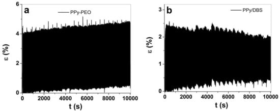 The strain at 0.1 Hz in TBAPF6-PC (Table 2) of PPy-PEO linear actuators revealed nearly 1.8 times higher values in strain rates and 1.5 times higher diffusion coefficients in comparison to PPy/DBS. The second best actuation properties are found for EDMICF3SO3-PC electrolyte with nearly 1.4 times higher strain, 1.7 times higher strain rates and 1.1 times higher diffusion coefficients for PPy-PEO films. The electrolyte NaClO4-PC electrolyte (Table 2) revealed better values in PPy-PEO due to mainly anion-driven reaction, while mixed actuation was detected in PPy/DBS (Figure 5b), which lowered the diffusion coefficient 1.3 times. So far, in view of the best electrolyte with the best actuation values, the electrolyte TBAPF6-PC stood out for PPy-PEO films. In view of reliable actuators regarding which electrolyte has the best response, long-term measurements were performed at 0.1 Hz frequency up to 1000 cycles. The results are shown in Figure 7.
