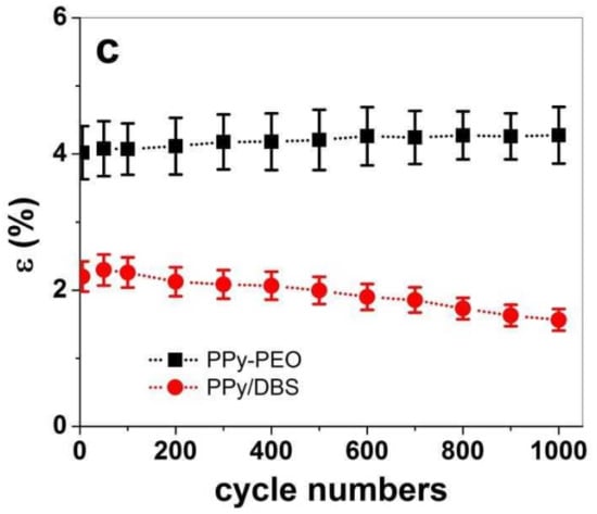 The long-term measurements revealed that small creep appeared in both PPy films, in the range of 0.28% for PPy-PEO (Figure 7a) and 0.34% (Figure 7b) for PPy/DBS. The creep is not fully understood, but it is basically a shifting of the starting position partly explained by irreversible charging []. Other research was made in the past to draw high creep development to high loads during reversible redox cycles of PPy linear actuators []. Figure 7c shows the strain against cycle numbers with increasing strain for PPy-PEO and decreasing strain for PPy/DBS films. The linear strain profiles shown in Figure S4a for PPy-PEO show a slight increase in strain (4.02% at cycle 5 and 4.27% at cycle 1000), while for PPy/DBS the strain decreased and was found as 2.2% at cycle 5 and 1.56% at cycle 1000 (Figure S4b). PPy-based composites are faradaic actuators; therefore, the charge density increases if strain increases, as shown in Figure S4c for PPy-PEO films. In the case of PPy/DBS, the strain decreased in long-term measurements, which is also reflected in the lower charge density shown in Figure S4c. The general conclusion is that the electrolyte TBAPF6-PC, being preferred in PPy linear actuators [], is also shown as beneficial with the best strain, strain rate and long-term cycling in PPy-PEO composite films, suitable for future consideration in artificial muscle-like applications.