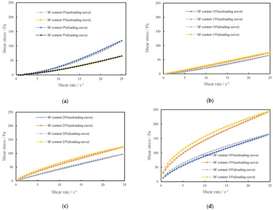The effect of the silica fume content on the rheological properties of CSHWMs is well reflected by the rheological curves. The loading and unloading curves of the rheological tests with W/B ratios of 0.19 and 0.23 and silica fume contents ranging from 0 to 35% are presented in Figure 4 and Figure 5. The unloading curve of each CSHWM is below the loading curve, forming a hysteresis loop. This is due to the destruction of the flocculation structure and homogenization of solid particles in the CSHWM under the action of stirring during the rheological test, which resulted in a lower shear stress in the unloading process than in the loading process at the same shear rate [15].