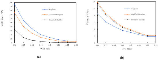Figure 11 shows the relationship between the plastic viscosity, yield stress, and W/B ratio fitted using the three models.