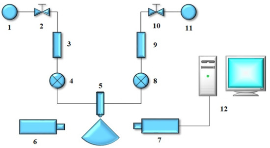 Nozzle atomization performance test system. 1—water source; 2—water pressure stabilization control valve; 3—liquid glass rotameter; 4—liquid pressure gauge; 5—experimental nozzle; 6—laser transmitter of laser particle sizer; 7—laser receiver of laser particle sizer; 8—gas pressure gauge; 9—gas glass rotameter; 10—gas pressure reducing and stabilizing valve; 11—gas cylinder; 12—data processing computer.
