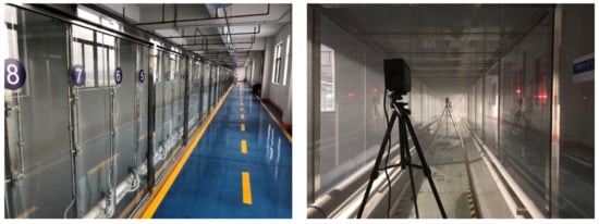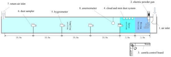 By reading the related literature, it has been found that the area of the roadway section involved in most laboratory simulations of dust sedimentation is 1.8–2.5% of the actual roadway sectional area. The simulation test of dust sedimentation in a small-scale simulated roadway has natural deficiencies; for example, the flow field distribution in a small-scale simulated roadway is greatly different from that in an actual excavation roadway, and the natural sedimentation rates of dust, especially respirable dust, in the two roadways are also different. Besides, the spray droplets present different diffusion trends in the two [19,20]. An experimental system of gas–liquid two-phase spray dust sedimentation, which could simulate the ventilation, dust production, etc., in the excavation roadway of coal mine, was designed by adhering to the concepts of improving the experimental safety and stability and enhancing the scientificity of the experimental data and the principle of high compliance with the actual excavation roadway (Figure 2 and Figure 3).