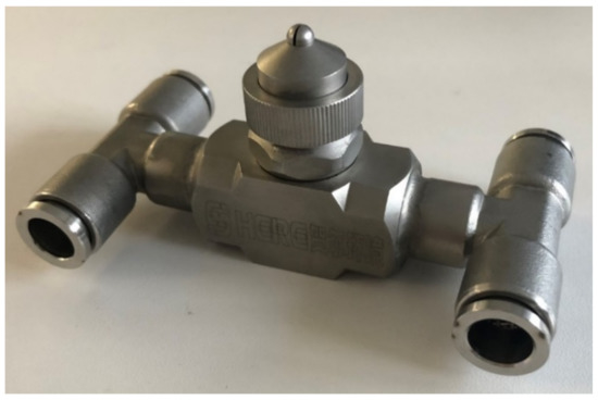 The gas–liquid two-phase atomizing nozzle was used in the experiment (Figure 4). Water flows that entered the nozzle were atomized into small-sized water mist in a solid cone. The size of the atomized particle and flow rate of the nozzle were controlled by regulating the gas pressure and water pressure.
