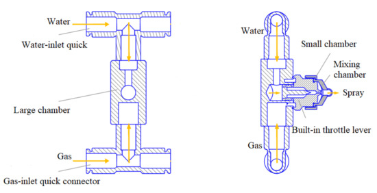 The internal structure of the nozzle is shown in Figure 5. The working principle of the gas–liquid two-phase atomization nozzle is that the water and air entered the atomization nozzle from the water-inlet quick connector and gas-inlet quick connector. Water entered the large chamber through the flow channel, and the large channel was provided with a throttle lever to limit the flow and control the speed of the water, increase the relative speed between the water and gas, maximize the atomization effect of the gas to the water in unit area, and achieve a good atomization effect of the two-phase flow nozzle under low air pressure. At the same time, air entered the small chamber from the flow channel. In the small chamber, the air hole was provided with a deviation angle. There was a certain angular deflection in axial and horizontal directions to form a rotational flow channel. Then, the eddy airflow effect was produced to increase the flow rate of gas. The airflow moved clockwise at a high speed along the gas flow channel to enter the mixing chamber and directly impact liquid from the water hole in the gas–liquid mixing chamber. With mutual impact, squeezing, shearing, and other effects between the gas and the liquid, water was crushed to slight fogdrops. In addition, the mixing chamber was equal to a resonance chamber. High-speed gas functioned in the mixing chamber back and forth to produce ultrasonic resonance. With the pulling effect of ultrasonic waves, water was further refined to complete initial atomization. At last, the convergence of gas–liquid two-phase flow was accelerated through the swelling site of the fog outlet. The liquid drops were refined after further absorbing the kinetic energy of the gas. Therefore, secondary atomization was formed at the fog outlet.