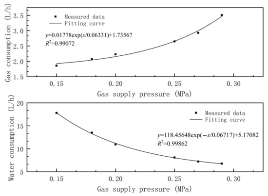 The fitting curve correlation coefficients of flow rate of the nozzle were all higher than 0.99, proving the high correlation between the flow rate and gas supply pressure. It can be seen from the fitting curve that, when the water supply pressure is 0.20 MPa, the gas consumption increases exponentially as the gas supply pressure increases. According to the fitting curve between water consumption and gas supply pressure, the water consumption of the gas–liquid two-phase flow nozzle attenuates exponentially with the increase in gas supply pressure when the water supply pressure is 0.20 MPa.