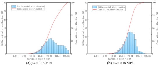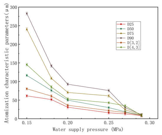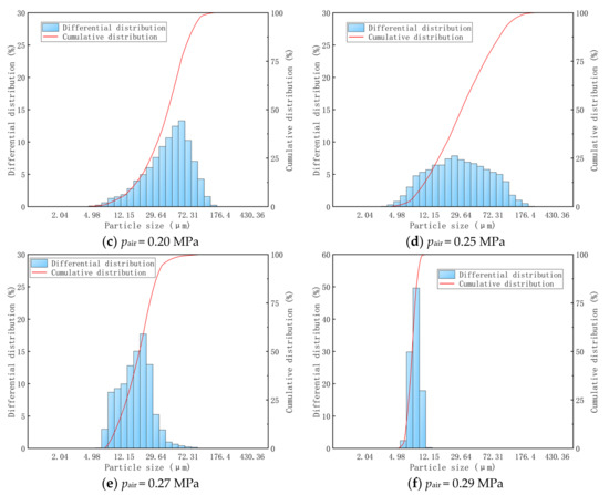 The size distributions of the mist particles that are produced by the gas–liquid two-phase flow nozzle when the water supply pressure is 0.20 MPa and the gas supply pressure is 0.15 MPa, 0.18 MPa, 0.20 MPa, 0.25 MPa, 0.27 MPa and 0.29 MPa are shown in Figure 7. Obviously, all the parameters that describe the mist particle size, including D25, D50, D75, D90, D[3,2] and D[4,3], decrease with the increase in the gas supply pressure from 0.15 MPa to 0.29 MP when the water supply pressure is 0.20 MPa.