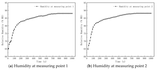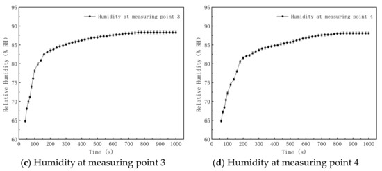 It can be seen from Figure 9 that the overall variation trends of humidity at four measuring points in the simulation roadway are the same, and the air humidity at four measuring points increases as time goes on. Under the same initial humidity of 64.8% RH at different points, the ambient humidity values at the measuring points one, two, three and four were increased by 18.5% RH, 18.8% RH, 19.5% RH and 18.0% RH, respectively, at 260 s in comparison with the initial humidity, and by 23.2% RH, 23.3% RH, 23.5% RH and 23.3% RH, respectively, at 840 s. This is because the gas–liquid two-phase flow nozzle system in the simulation roadway has been in the working state all the time. Fogdrop particles evaporate continuously after they enter into the roadway through the nozzle, so the air humidity of the roadway increases continuously. The growth rate of the air humidity at the measuring points is relatively high in the beginning, but it decreases gradually and finally tends to be stable. With the continuous evaporation of fogdrops, the temperature in the roadway decreases gradually, and the difference between the practical vapor pressure in the roadway and saturated vapor pressure declines gradually. According to the Dalton law, the evaporation rate of fogdrops decreases. In other words, the growth rate of the air humidity decreases gradually and the air humidity in the roadway is constant. Air humidity values at four measuring points begin to change at different times. After the nozzle system is turned on, air and fogdrop particles with a high humidity enter into the simulation roadway through the nozzle. The air humidity at measuring point one increases accordingly. The air humidity at measuring points two, three and four begins to increase at 20 s, 40 s and 60 s after the turning on of the nozzle system. This is because measuring points two, three and four are at the downwind side of measuring point one and they are 10.0 m, 20.0 m and 30.0 m away from measuring point one. The airflow rate in the simulated tunnel is 0.5 m/s. Hence, the time for the arrival of air that has a high content of fogdrops at adjacent measuring points is 20 s.