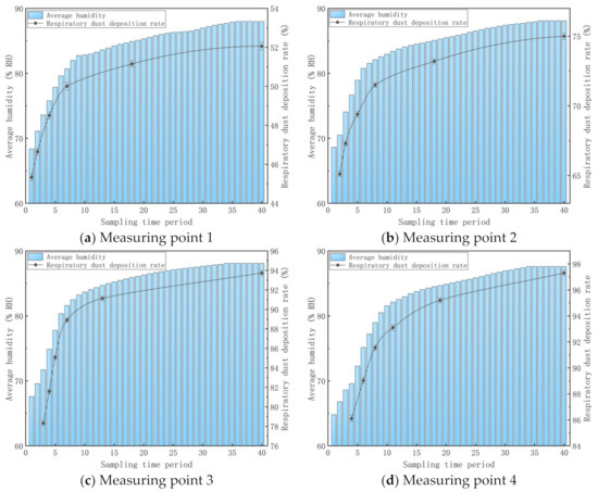 It can be seen from Figure 10 that the mean humidity of the four measuring points increases continuously as time goes on. The growth rate of the mean humidity is relatively high in the beginning, but it decreases gradually. The mean humidity values at measuring point one in six intervals of 0–60 s, 20–80 s, 60–120 s, 120–180 s, 340–400 s and 780–840 s are 68.4% RH, 71.1% RH, 75.8% RH, 80.7% RH, 84.9% RH and 88.0% RH, respectively. These six intervals were chosen as the respirable dust sampling time at measuring point one. The mean humidity values at measuring point two in six intervals of 20–80 s, 40–120 s, 80–140 s, 140–200 s, 340–400 s and 780–840 s are 70.5% RH, 74.1% RH, 78.9% RH, 82.1% RH, 85.0% RH and 88.1% RH, respectively. These six intervals were used as the sampling time of respirable dust at measuring point two. The mean humidity values at measuring point three in six intervals of 40–100 s, 60–120 s, 80–140 s, 120–180 s, 240–300 s and 780–840 s are 71.7% RH, 74.9% RH, 77.8% RH, 81.6% RH, 84.7% RH and 88.3% RH, respectively. These six intervals were used as the sampling time of respirable dust at measuring point three. The mean humidity values at measuring point three in six intervals of 60–120 s, 100–160 s, 140–200 s, 200–260 s, 360–420 s and 780–840 s are 69.6% RH, 75.1% RH, 79.0% RH, 82.1% RH, 84.7% RH and 88.0% RH, respectively. These six intervals were used as the sampling time of respirable dust at measuring point four.