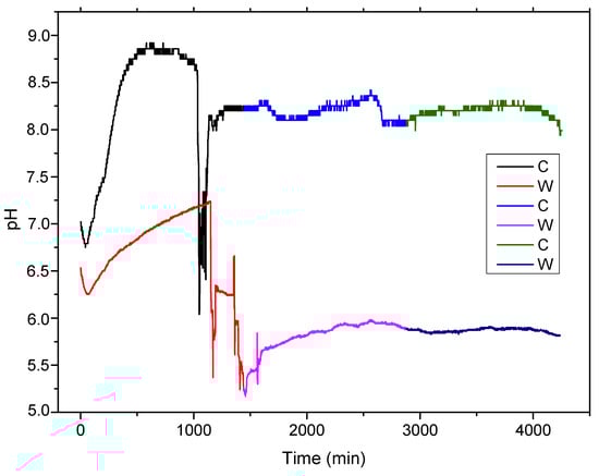 3.2. Electrolyte Solution pH Variation in Contact with Metallic Sample Analysis