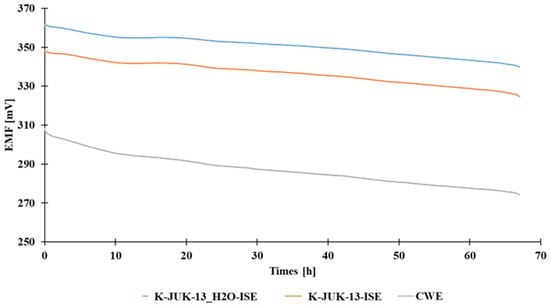After conditioning, the studied solid contact electrodes were calibrated in potassium chloride solutions with concentrations ranging from 10−5 to 10−1 mol L−1. For comparative purposes, the calibration was carried out for a coated wire electrode (CWE) as well, following the same scheme. The obtained calibration curves are shown in Figure 1. All tested electrodes exhibited good sensitivity to K+ ions in the same linear range. The CWE provided a linear response in the tested concentration range of K+ with a slope of 53.94 mV/decade. The use of JUK-13 as the ion-to-electron transducer does not have any impact on the response of a potassium selective membrane. This is confirmed by the obtained slope value of the calibration curve for the respective material. Moreover, the use of JUK-13_H2O caused the sensitivity of the electrode to increase by 2 mV/decade in comparison with the sensitivity of the CWE electrode.