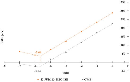 In order to determine the limit of the detection (LOD) of the studied SC and CW electrodes, the calibration measurements in the concentration range 10−7 to 10−1 mol L−1 were carried out. The LOD was calculated as the intersection of two lines as shown in Figure 3. For SC-type and CW-type electrodes, the LOD equals 2.1 × 10−6 mol L−1 and 1.8 × 10−6 mol L−1 K+, respectively. The utilized MOF has no impact on the LOD value.