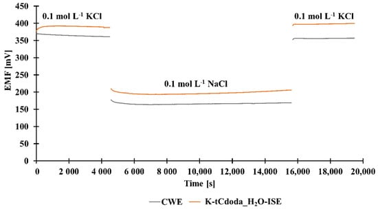 The water layer test was carried out according to the procedure suggested by Fibbioli et al. [31]. Before the test, the electrodes, i.e., K-JUK-13_H2O-ISE (SC-ISE) and CWE, were conditioned in 10−1 mol L−1 of primary ion solution. First, the potential of the electrodes was recorded in 10−1 mol L−1 KCl for 1 h, then in a solution of the interfering ion (10−1 mol L−1 NaCl). After 3 h, the interfering ion solution was replaced by a primary ion solution. The obtained results are shown in Figure 4.