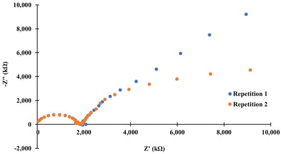 EIS measurements aimed to study the function of the MOF as a transducer layer and to verify whether the tested material possesses good electrical and ionic conductivity or/and sufficiently high redox capacitance providing the stability of measured potential during the flow of a little electric charge through the system. The spectra were measured in 10−1 mol L−1 potassium chloride solution. The impedance spectra of the studied electrode with the MOF as the transducer layer are shown in Figure 5.